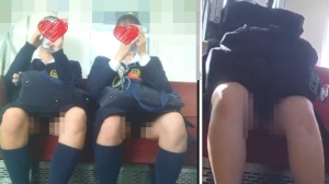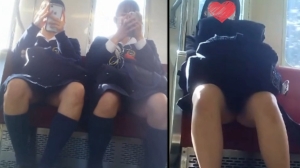 似た者同士で脚を開きっぱなしな2人。 あと1人は、リュックで隠しているつもりです。 ローアングルの対面でじっくり撮影成功です。